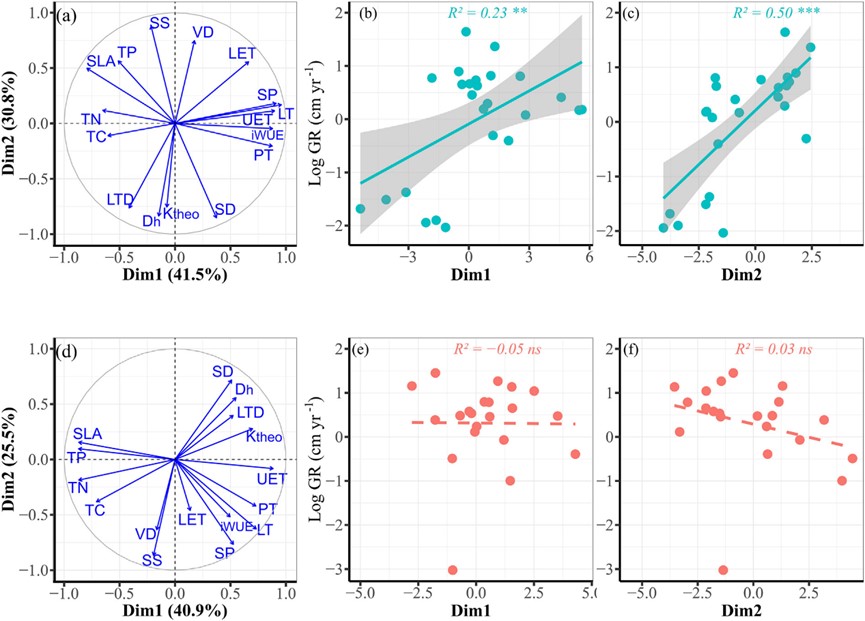 進(jìn)一步研究發(fā)現(xiàn),熱帶喀斯特森林中常綠樹種的雨季生長速率與耐旱性狀顯著相關(guān):導(dǎo)管密度越大、葉片厚度越大、水分利用效率越高,雨季生長速率越大;而導(dǎo)管直徑越大,生長速率越小。這意味著常綠樹種的生長依賴“耐旱能力”,安全的水力系統(tǒng)與保水的葉片結(jié)構(gòu)讓它們在干旱的環(huán)境中得以持續(xù)生長。落葉樹種的生長速率與耐旱性狀無顯著的相關(guān)關(guān)系——它們更多是通過“落葉避旱”的策略,在雨季快速利用水分生長,較少依賴復(fù)雜的耐旱性狀的調(diào)控。